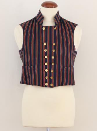Smalrandig väst med ränder i grönt, blått, gult, rött och vitt på blå botten, hög krage, knäppt med 8 par små stölingar ända upp.