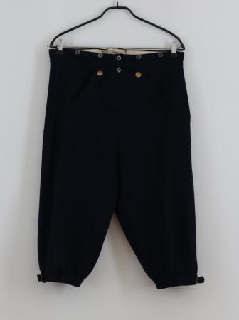 Knäbyxor av mörkblå vadmal med smal lucka, knäppt med två stora mässingsknappar , med lininng och släta rektangulära knäspännen vid knäna.