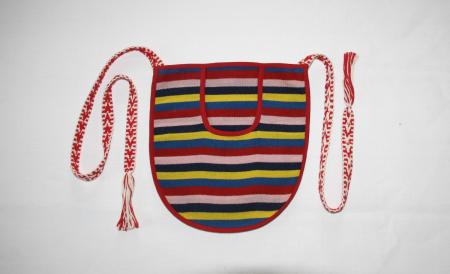Kjolsäck med ränder i blått, rött, lila och gult. Från Purmo.