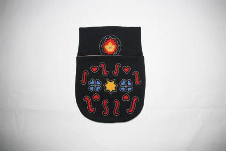 Kjolsäck svart med urklippta figurer sydda i langettsöm med olika färgade botten under enkel ficka. Från Helsinge.