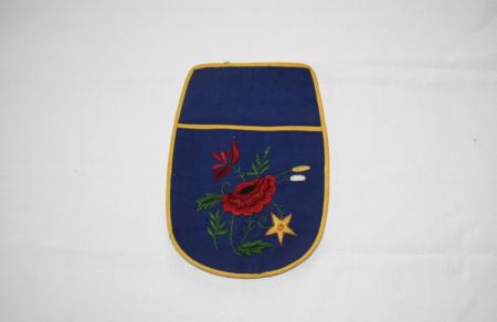 Blå med gula kanter och broderier i stjälkstygn. Från Munsala.