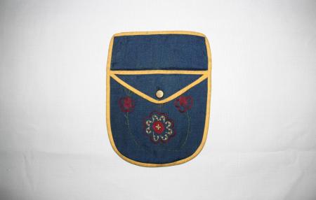 Blå med gula kanter, dubbelficka, broderier i rött, gult, brunt och grönt. Från Borgå.