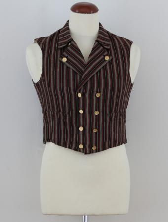 Heikels ursprungliga anteckning: Väst av randigt tyg med svartbrun botten och ränder tegelrött, svart, vitt, grått och gult med nedvikt krage och uppslag, knappar på uppslagen och i vinkeln mellan kragen och uppslaget, 4 par knappar i rader, som närma sig varandra nedåt, två snett sydda fickor, rygg av samma tyg, tillsnöres med röda snören.