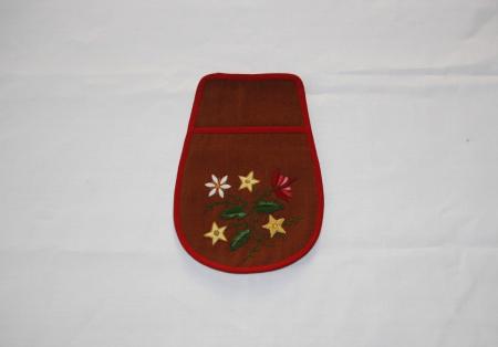Brun med röda kanter. Rak ficka. Broderier i grönt, gult, rött, rosa, orange och vitt. Från Nykarleby.