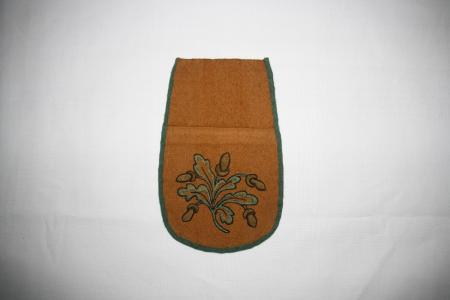 Kjolsäck av gult tyg med gröna kanter och broderier av ekblad och ekollon. Från Ekenäs.