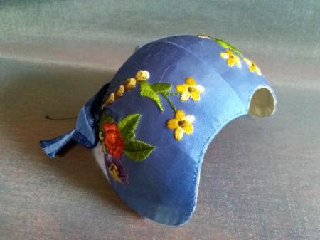 Styckomössa, blå, broderad i schattersöm med blå hakband. Från Socklot, Nykarleby.