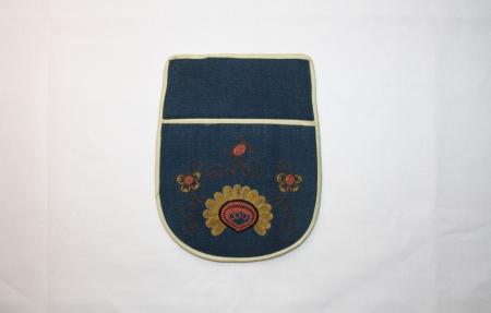 Kjolsäck blå med beigefärgade kanter och broderier i kedjesöm, enkel ficka. Från Liljendal.