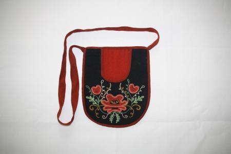 Yttre delen svart, inre delen mörkröd, mörkröda kanter. Broderier i rosa, mörkrött, vitt samt tre nyanser av grönt. Från Föglö.