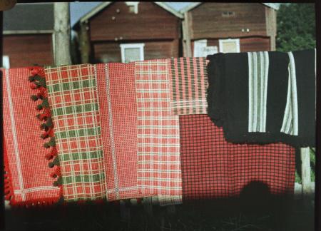 Fälltäcken, vepor och schal hos Helmi Berts, Petsmo, Kvevlax. Fotograferat i september 1926.