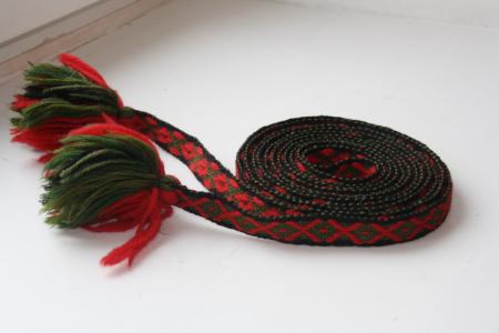 Vävt band med grönt botten, röda inslag, svarta kanter. Från Sund.