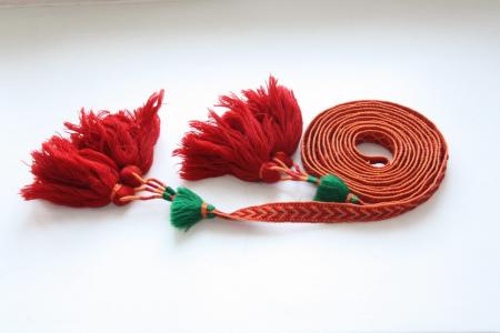 Band med orange botten, röda och gröna inslag.Två röda tofsar fastsatta med tvinnade band i varje ände. Från Korsnäs.