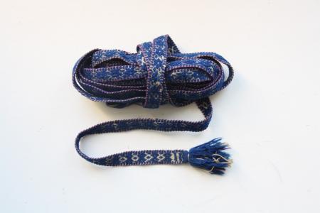 Vävt band i blått och vitt/beige med lila kanter. Till kvinnlig sorgdräkt från Tjöck-Lappfjäd.