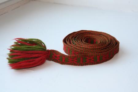 Vävt band i rött och grönt. En ände (med tofs) avklippt. Från Vörå.
