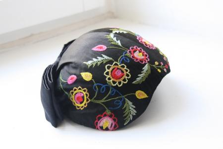 Svart med blombroderier i rosa, rött och gult. Från Helsinge.