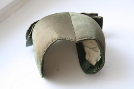 Mörkgön styckemössa i siden med rosett.