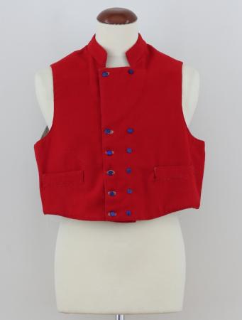 Röd väst med ståkrage, knäppt med 6 par vita eller blå spegelglasknappar, så kort att skjortan syns.