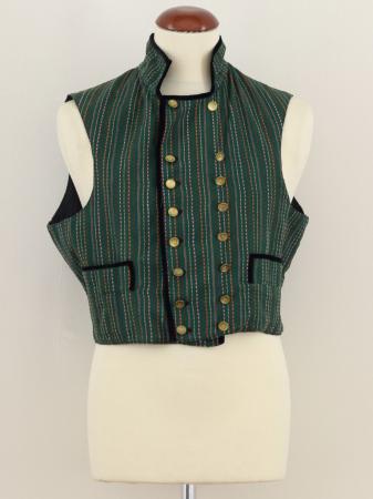 Randig väst med smala ränder med s.k. hoppor, finnkors på grön botten, så kort att skjortan syns, hög krage, knäppt med 8 par små stölingar, framkanterna och fickklaffarna kantade med svart sammet.