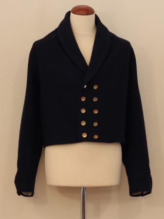 Rocken av mörkblå vadmal, midjelång och med sjalkrage. Knäpps med 5 par stölingar, ryggen vid sidsömmarna är slät med svängda sidsömmar med en stölling. Ärmarna har uppslag med tre stölingar