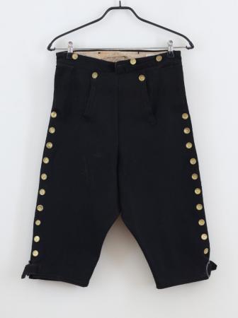 Knäbyxor, svarta, smal lucka knäppt med 2 stora stölingar, ficka i vardera sidsömmen, längs sidsömmen stora stölingar, knäspännen av silverfärgad metall. Knäbyxdräkt, från slutet av 1700-talet och början av 1800-talet.