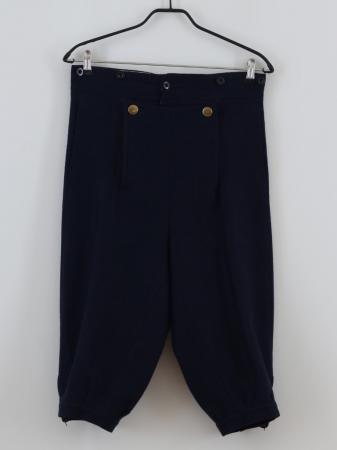 Knäbyxor av mörkblå vadmal med smal lucka knäppt med två nickelknappar. Vid knäna ovala nickelspännen.