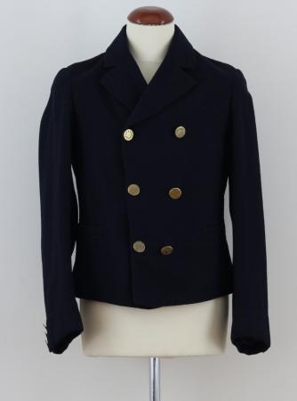 Rock av mörkblå vadmal, krage och slag med knapphål, knäpps med 3 par stölingar. I ryggen mittsöm och sidsömmar med skörtveck prydda med 1 stöling. I midjehöjd en söm från sidsömmen till mitt fram, ärmuppslag med 3 stölingar.