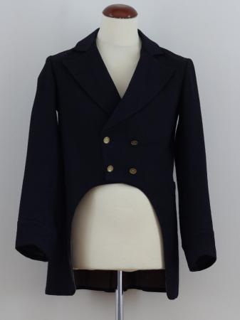 Rock av mörkblå vadmal, frackmodell, dubbla stölings rader. Nedvikt krage och uppslag. Ryggen har mittsöm och svängda sidosömmar, som slutar med dubbla veck. Ärmarna har uppslag med två stölingar i uppslaget.