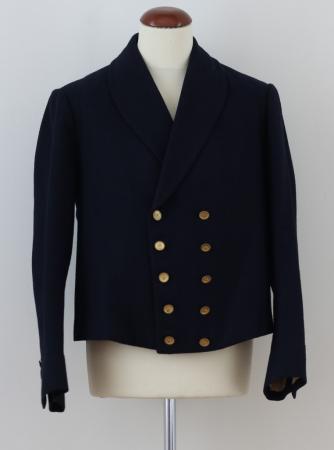 Rock, mörkblå, sjalkrage, midjelång, knäppt med 5 par stora stölingar, ärmuppslag med 2 små stölingar, slät rygg utan knappar och skört.