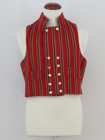 Randig väst i vinrött, gult, svart, grönt, blått och gult på röd botten, hög krage, knäppt med 6 par stora stölingar, så kort att skjortan syns.