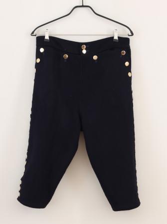 Mörkblå knäbyxor med tämligen bred lucka som dock inte når ut till sidsömmarna, knäppt med 4 stora platta mässingsknappar, 21 knappar längs sidan, knälinning saknas.