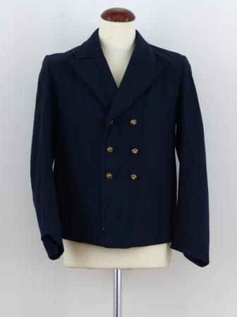 Blå rock, bred nedvikt krage och stora slag, knäppt med 3 par stora wasapuggar, tre långa skörtveck i ryggen, de två yttersta med var sin stor knapp upptill.