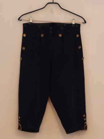 Mörkblå knäbyxor, smal lucka knäppt med 2 stora stölingar, lodräta ficköppningar i sidsömmen prydda med 3 små stölingar vid vardera fickan, 3 små stölingar vid knäsprundet.