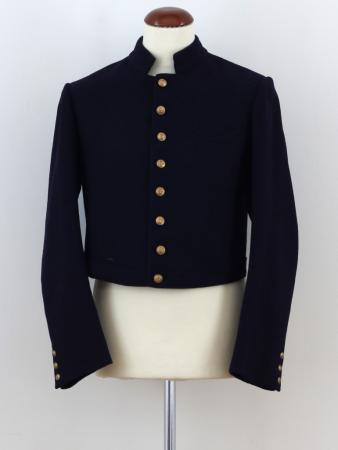 Mörkblå midjelång rock knäppt med 8 stora ankarknappar, den nedersta sydd på kanten som löper längs rockens fåll, låg ståkrage, sned bröstficka på vänster sida.