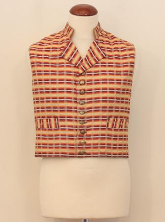 Väst av rutigt halvylletyg i vitt, rosa, citrongult, orange, brunt, rött, vinrött, svart och gulbeige, ståkrage, knäppt med 9 små ankarknappar, ryggstycket kan även sys av naturfärgad linnelärft.