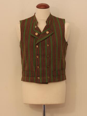 Väst, randigt halvylletyg i rött, svart och gult på grön botten, knäppt med 6 par stölingar (ett par i vinkeln mellan krage och slag, ett par knäppt genom slaget).