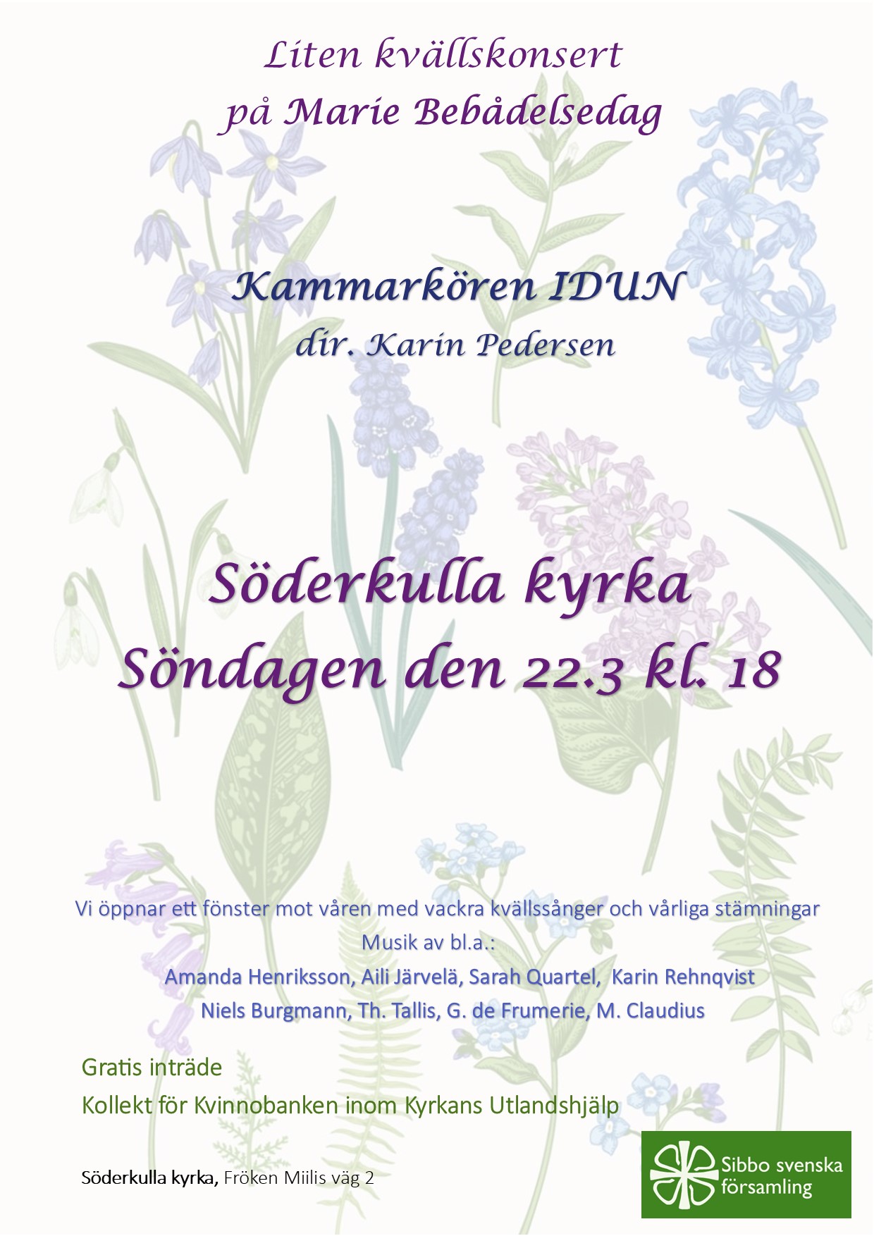 Tisdag 26.8 kl. 19 Söderkulla kyrka, Fröken Miilisväg 2, Sibbo